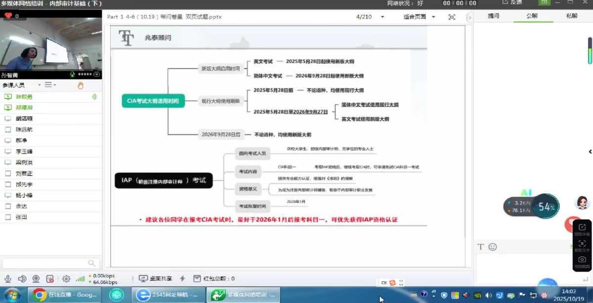 此次内部审计线上共享课堂的内容紧密结合内部审计实践需求,覆盖关键实务知识,不仅深化了学生对内部审计基础的理解,更提升了其运用理论知识解决实际问题的能力,为后续内部审计的学习打好基础。