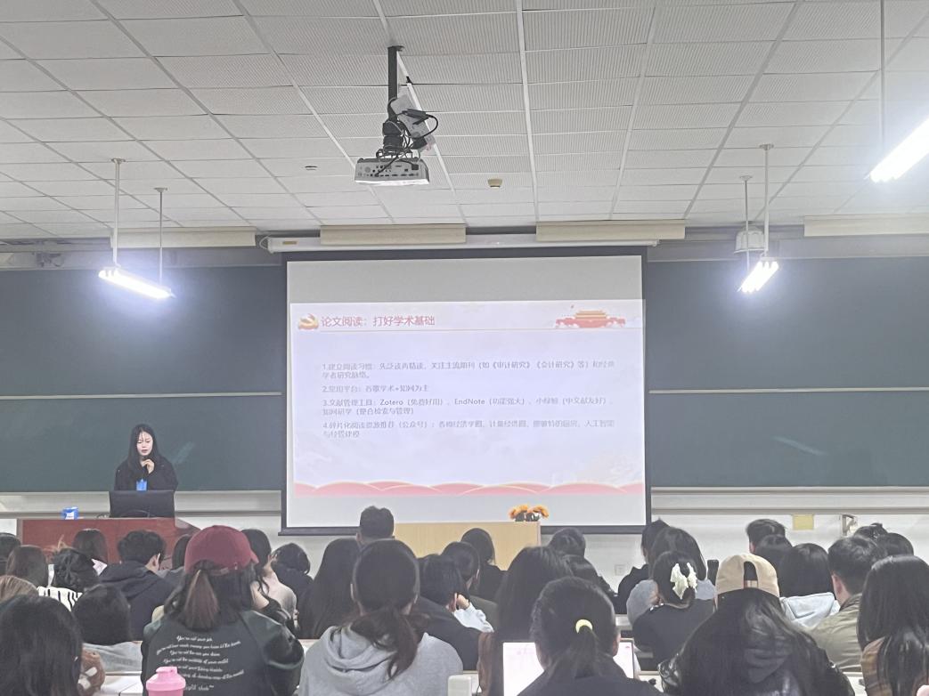 论坛第二部分“练本领”由审研24级黄祥鑫同学主讲,她以“论文写作与组会汇报”为题,从文献阅读、组会汇报、实证操作等方面展开分享。黄祥鑫同学建议大家建立良好的阅读习惯,在组会汇报中要注重逻辑清晰、表达自信,善于从师兄师姐的分享中汲取经验,在实证研究中循序渐进掌握SPSS、Stata、Python等工具,通过复现经典论文提升实操能力。