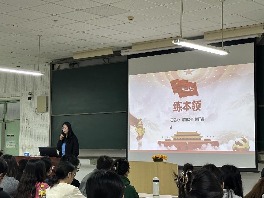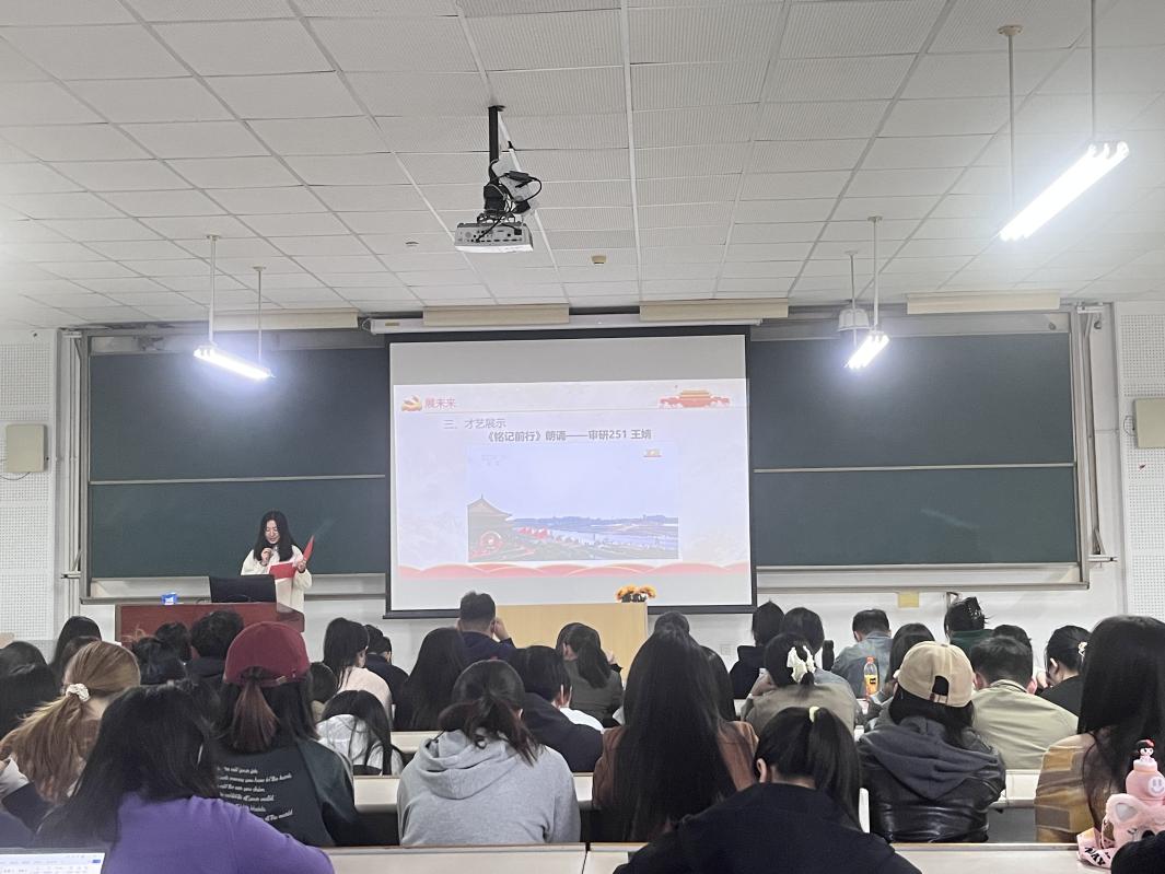 互动环节,通过“正话反说”等小活动,不仅锻炼了同学们的反应力和表达力,还进一步加深了同学们之间的互相协作与沟通。才艺展示环节中,审研25级王婧同学深情朗诵《铭记前行》,审研24级肖涵同学高歌《强军战歌》,以青春之声致敬历史、礼赞和平,充分展现了经管学子昂扬向上的精神风貌。