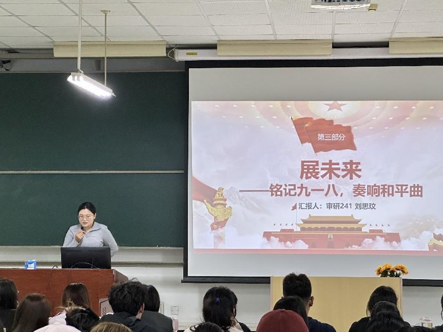 论坛第三部分“展未来”由审研24级刘思玟同学主讲。刘思玟同学以“铭记九一八,奏响和平曲”为主题,带领师生回望1931年“九一八”事变的历史伤痛,指出九一八的警钟与九三的号角交织回荡,警示我们唯有铭记历史、珍爱和平,才能以实力捍卫正义、以团结凝聚力量。