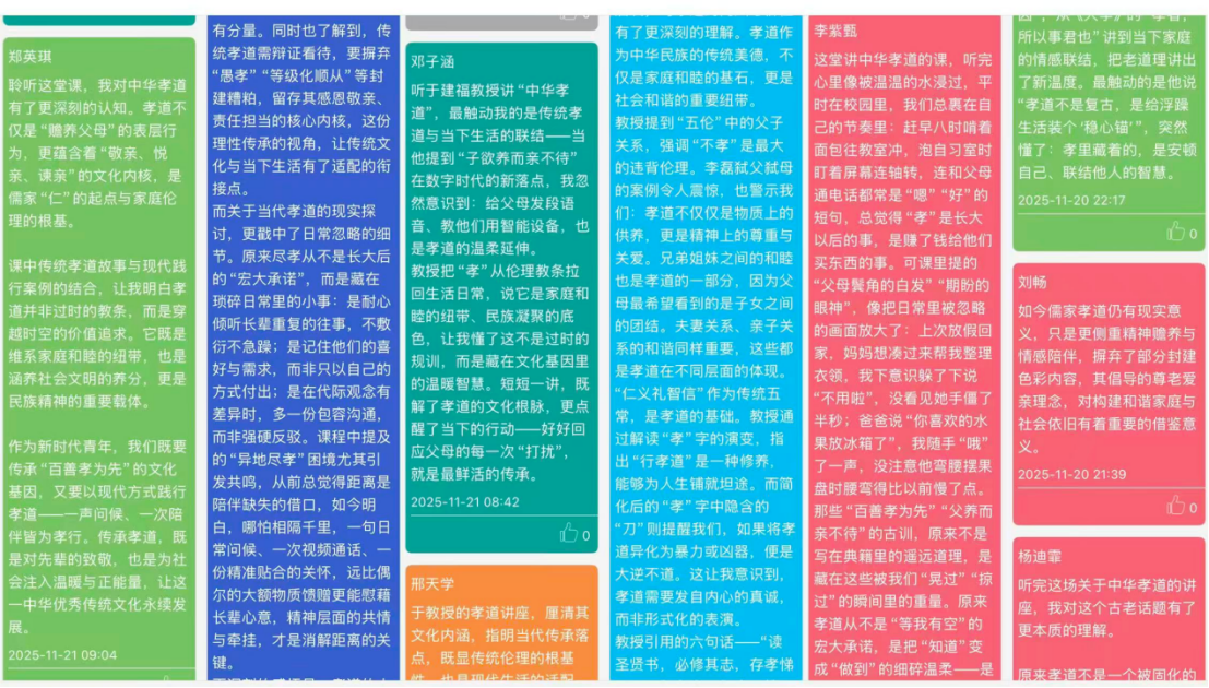 整场讲座在温馨而热烈的氛围中圆满落幕。师生们意犹未尽,随后通过云班课APP继续延伸讨论,纷纷表示将把所学所悟融入日常生活,以切实行动传承孝道文化,弘扬中华美德。
