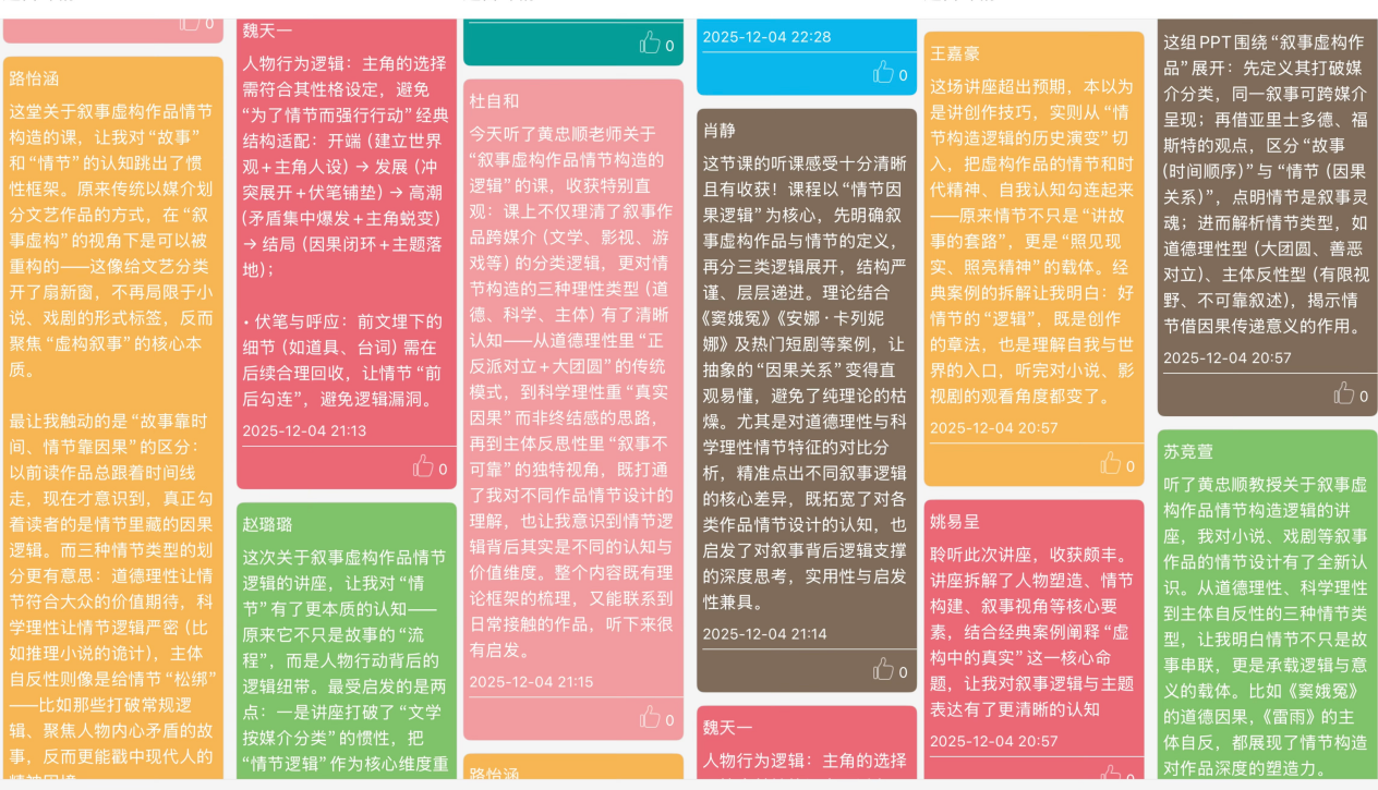 整场讲座内容丰富、逻辑清晰、例证生动,黄忠顺教授以其深厚的学养和深入浅出的讲解,引领在场师生进行了一次深刻的叙事学思辨之旅。讲座结束后,同学们迅速在云班课APP上围绕相关议题互动交流,展开了热烈的讨论。