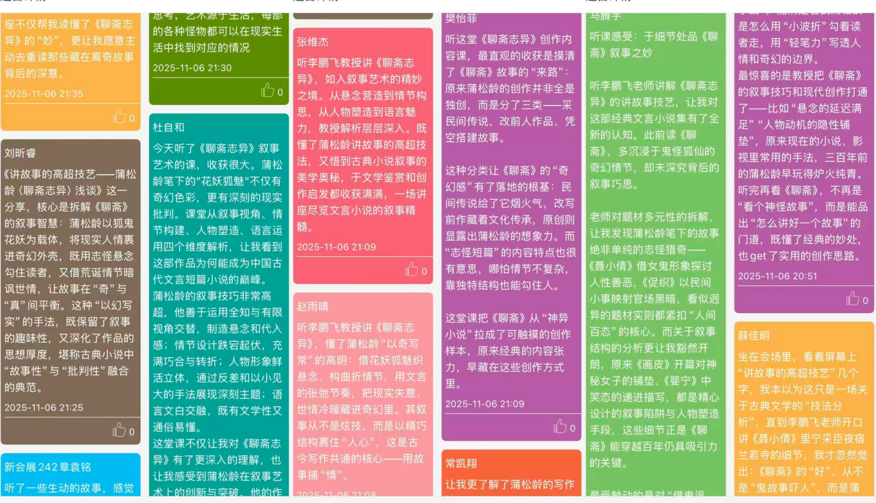 整场讲座不仅深化了同学们对蒲松龄文学成就的理解,更通过文本细读,使人切身感受到《聊斋志异》中如编剧般精巧的叙事艺术。正是这些跨越时代的文学技巧,让这部作品历经三百余年依然熠熠生辉,成为一座不朽的艺术丰碑。