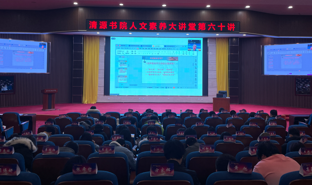2025年12月11日晚7时,清源书院人文素养大讲堂本学期第十讲(总第60讲)在清源校区致远讲堂圆满举行。作为年度收官之作,我校人文特聘教授、清源书院院长杨荣祥教授特以《人文艺术素养与综合素质的关系》为题作专题报告。讲座由人文社科学院杜冰心老师主持,我校150余名师生聆听了讲座。