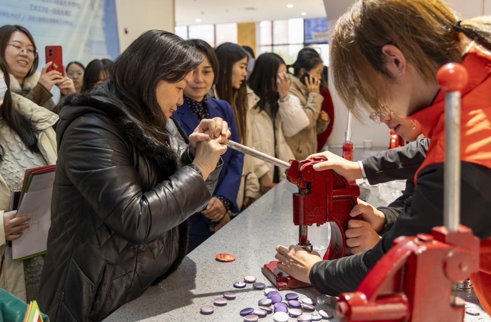 在后面的互动体验区,丰富的活动让党员师生沉浸式感受了舞美艺术的多元魅力:专业化妆师现场指导舞台妆容打造,从底妆塑形到眉眼刻画,让师生亲身实践“以妆塑人”的艺术逻辑;大家将舞美元素与文化符号相结合,亲手设计制作专属纪念徽章,在动手实践中激发创新思维;集章打卡活动则串联起博物馆、道具工坊、服装展厅等核心区域,让大家在探索中全面了解舞美艺术的创作全流程。