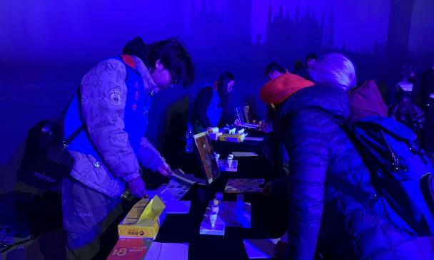 中国传媒大学徐晨鸥老师指导舞美创意空间,聂宁奕、孟璐同学在前台负责“乐”“剧”主题2套章,以及“拉克美”8套章、“莱茵的黄金”3套章的盖章服务;常文博同学在创作间负责道具制作讲解的现场秩序维护,保障体验活动有序开展。