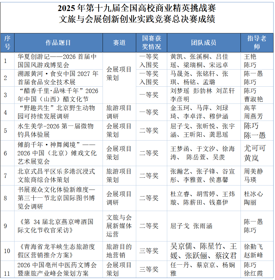 2025年11月26日,2026年(新加坡)国际商务会展策划大赛中国地区选拔赛暨第十九届全国高校商业精英挑战赛文旅与会展创新创业实践竞赛总决赛分组赛在线上圆满落幕。作为入选全国普通高校大学生竞赛榜单的国家A类赛事,本次大赛吸引了全国31个省、自治区、直辖市数百所高校的14000多支队伍同台竞技,相比往年,竞争更为激烈。总决赛线上赛结束后,从全国参赛项目一等奖获奖作品中评选出了295项入围参加中国地区选拔赛暨总决赛精英赛,并于11月21至23日在浙江永康举行。人文社科学院旅游与会展系学生团队在陈巧、陈一愚、黄岚、陶丽、王艳、尤可可、高苹、周美静等15位教师的悉心指导下,共11支参赛队伍凭借扎实的专业素养与创新的策划方案脱颖而出,斩获国家级奖项11项——其中一等奖4项、二等奖5项、三等2项,学校获最佳院校组织奖,15位指导老师荣获最佳指导教师奖。其中,由陈巧、陈一愚、王艳三位老师指导的2支队伍成功入围中国地区选拔赛暨总决赛精英赛,分别获得精英赛小组赛第4和第5名好成绩,将代表大陆地区高校赴境外参加2026年的多项国际赛事。