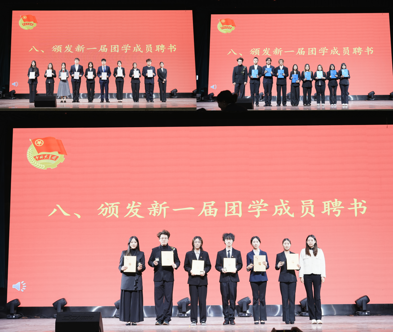 学生会执行主席张昕悦、屈子戈和王峥老师分别为干事代表、干部代表以及主席团成员颁发聘书。一纸聘书承载着信任与责任,象征着人文团学精神的薪火相传。