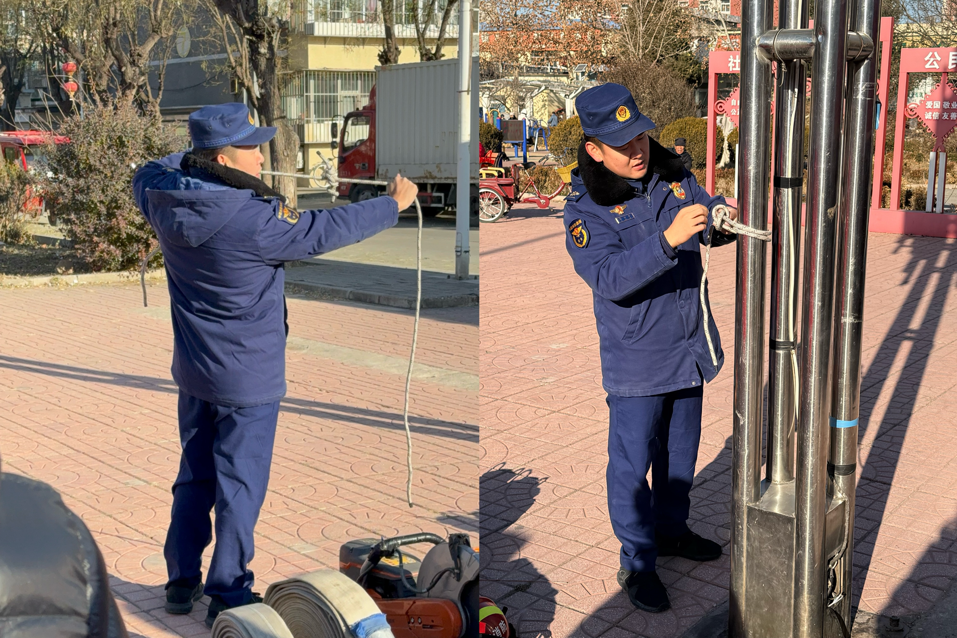 同学们认真聆听讲解,在消防工作人员的专业指导下逐步掌握灭火器操作、绳结打法等实用安全技能。志愿者们专心致志地投入消防绳结实操教学,与工作人员默契配合认真学习,身边展开的消防装备和社区环境相互映衬,传递出“人人学消防”的活动热度,助力大家领会“隐患险于明火,防范胜于救灾”的安全观念。