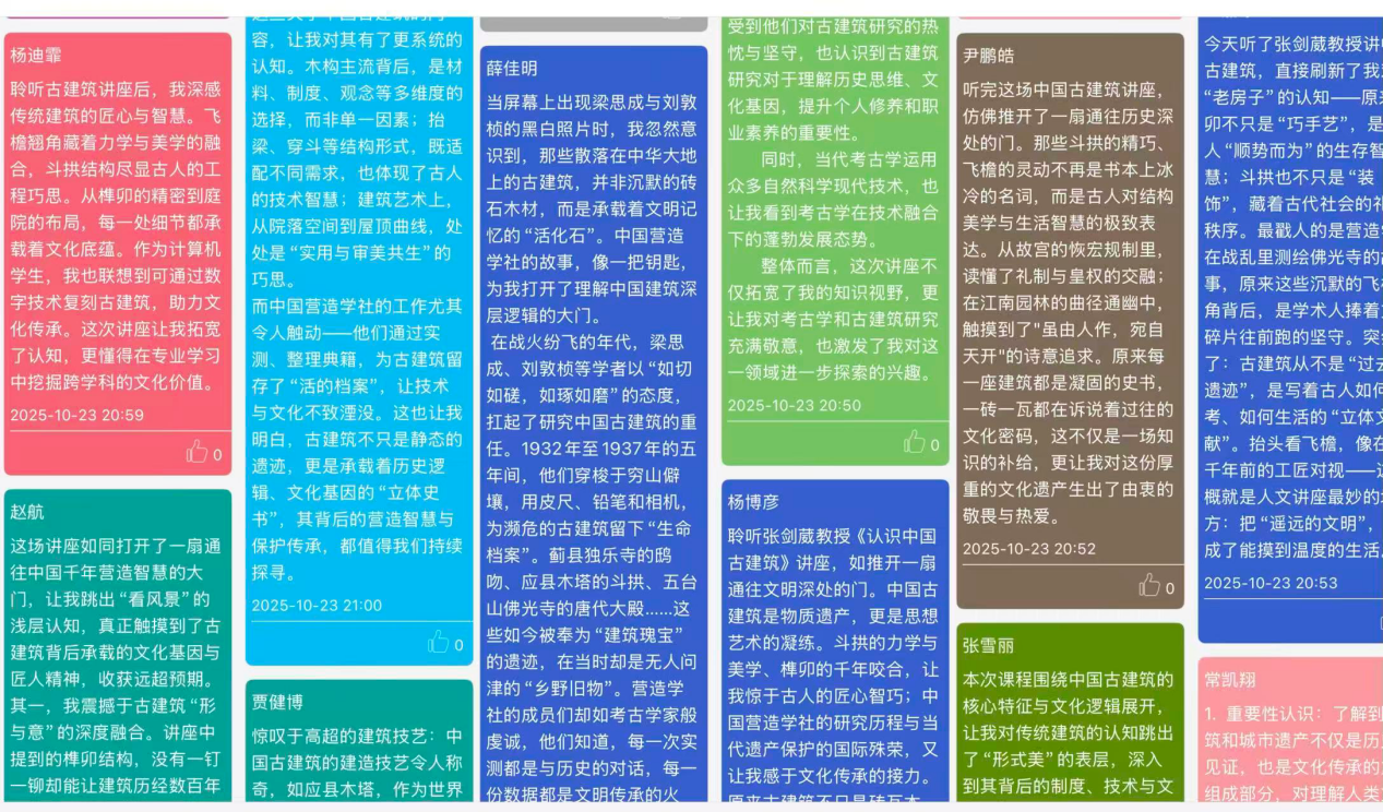 张教授的讲解激发了同学们的浓厚兴趣,大家思维活跃、兴致盎然,争相就过度开发古建筑的影响、古建筑的修复原则与全景测绘技术新进展等问题提问,张教授则深入浅出、妙语连珠,一一作出了解答。