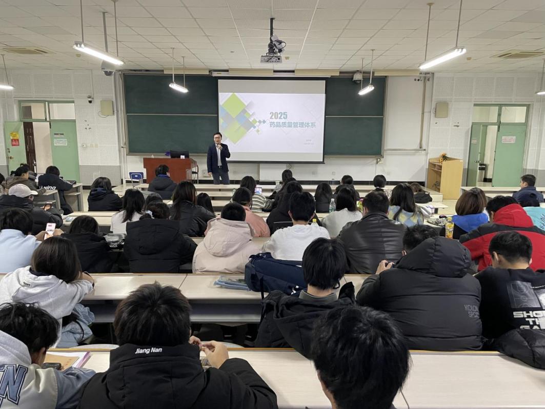 随后,石子矛校友以《浅谈药品流通行业的质量管理体系》为题,面向物流管理和供应链管理专业学生开展了一场专题讲座。他系统解读了行业政策与监管背景、药品经营质量管理规范(GSP)的核心要求,以及企业如何构建与实施高效的质量管理体系。讲座内容贴近实际、案例丰富,向学生展示了药品流通企业的实际运行情况,让学生对行业、企业有了更直观、深刻地认识。讲座中,学生们积极提问互动,氛围热烈。