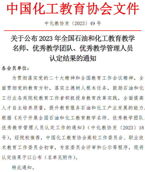近日,从中国化工教育协会获悉,我校新材料与化工学院陈飞教授带领的材料科学与工程专业教学团队、安全工程学院高建村教授带领的安全工程专业本科育人团队获评“全国石油和化工教育优秀教学团队”荣誉称号,教务处金红梅老师、安全工程学院李卫清老师获评“全国石油和化工教育优秀教学管理人员”荣誉称号。