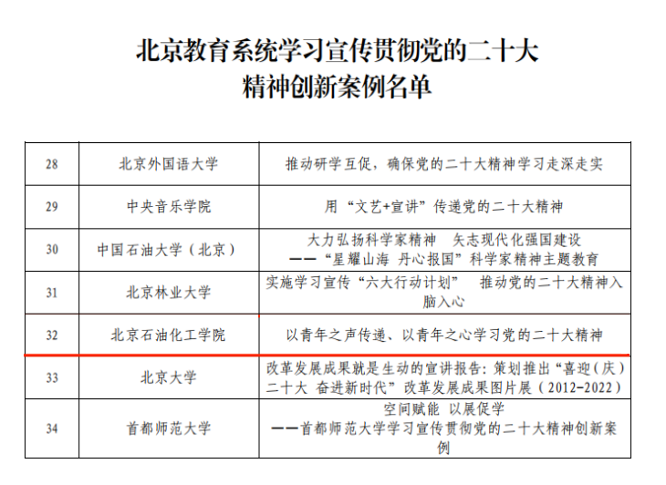 近日,北京市委教育工委公布了北京教育系统学习贯彻党的二十大精神创新案例评选结果,我校基于“学习宣传党的二十大精神学生宣讲团”报送的案例“以青年之声传递,以青年之心学习党的二十大精神”成功入选。