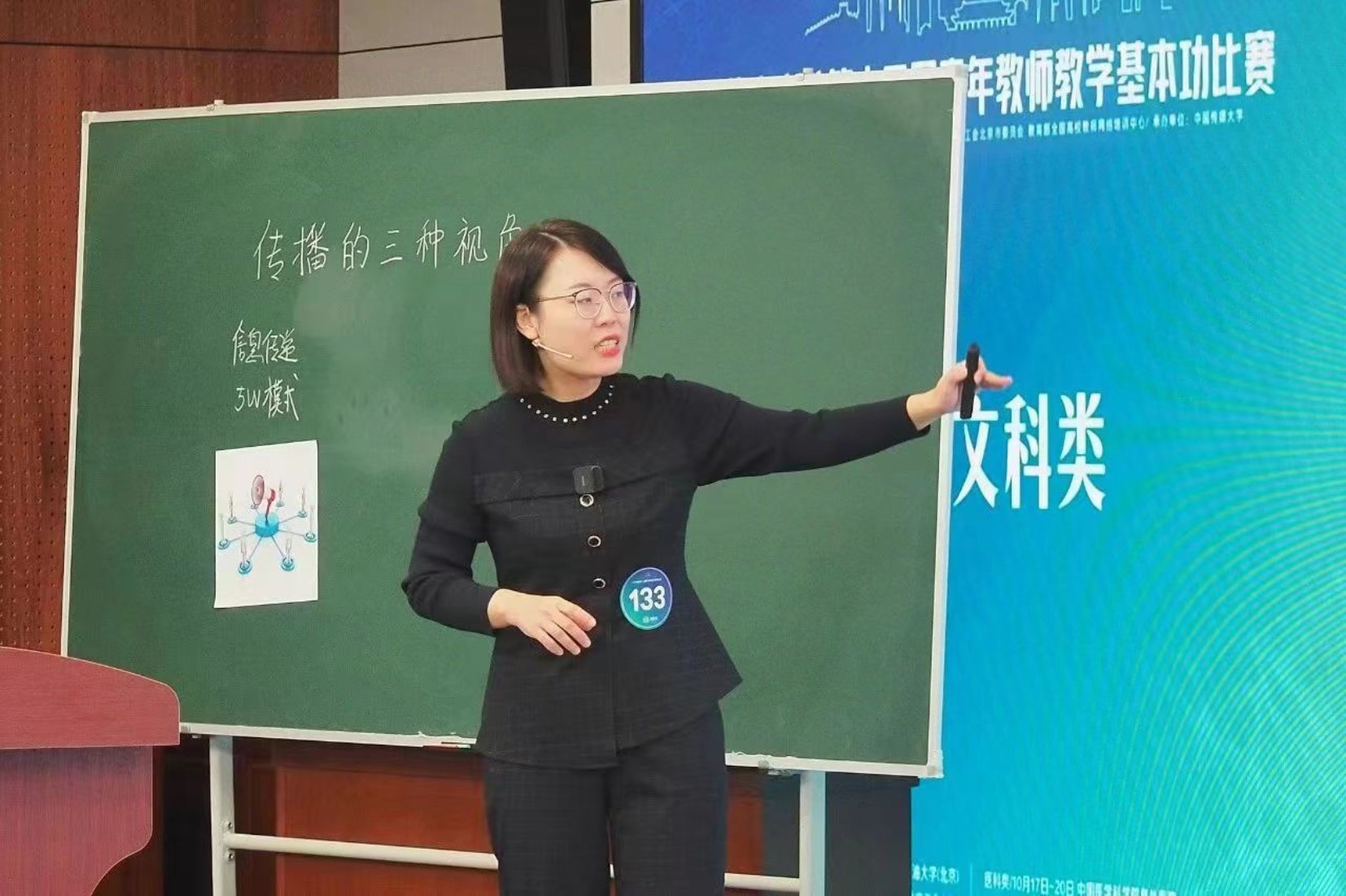 陶丽老师本次参赛课程是“传播学概论”,抽到的比赛内容是“传播的三种视角”。比赛中,陶丽老师以中国国家形象宣传片为案例深入浅出地介绍了传播的传递、共享和权力三种视角,作为课程引论锚定了传播研究的三种范式,以传播理论与专业实践的结合引导学生讲好中国故事。在比赛的20分钟时间里,陶丽老师沉着发挥,讲授流畅、条理清晰、教态大方,展现了我校青年教师的教学风采。