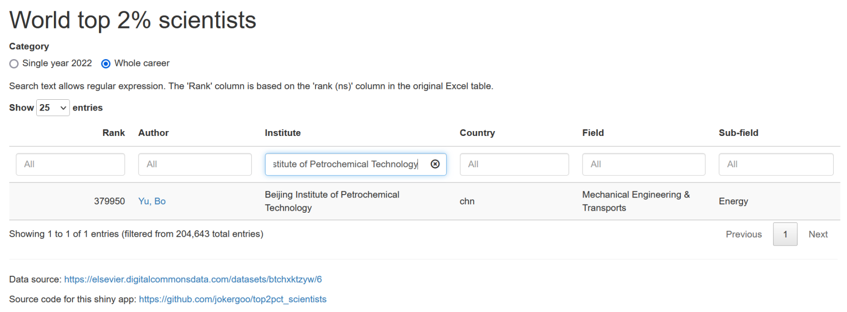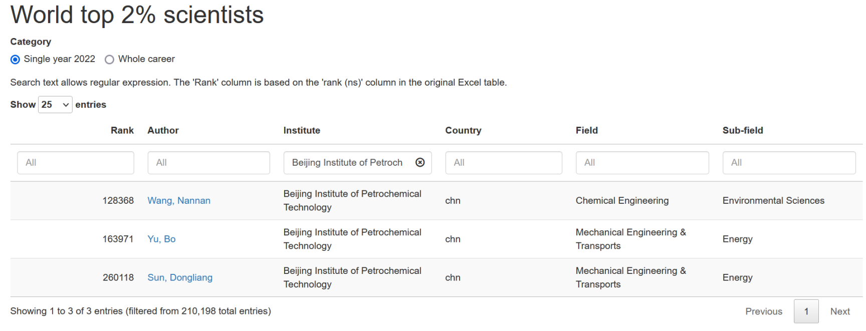 2022年度全球前2%顶尖科学家榜单(World’s Top 2% Scientists 2022)分为“终身科学影响力排行榜”和“2022年度科学影响力排行榜”。两个榜单分别对应1960年至2022年和2022全年两个时间区间的综合数据,入选全球前2%顶尖科学家榜单,意味着该学者在其研究领域具有较高的世界影响力,为该领域的发展作出了杰出贡献。