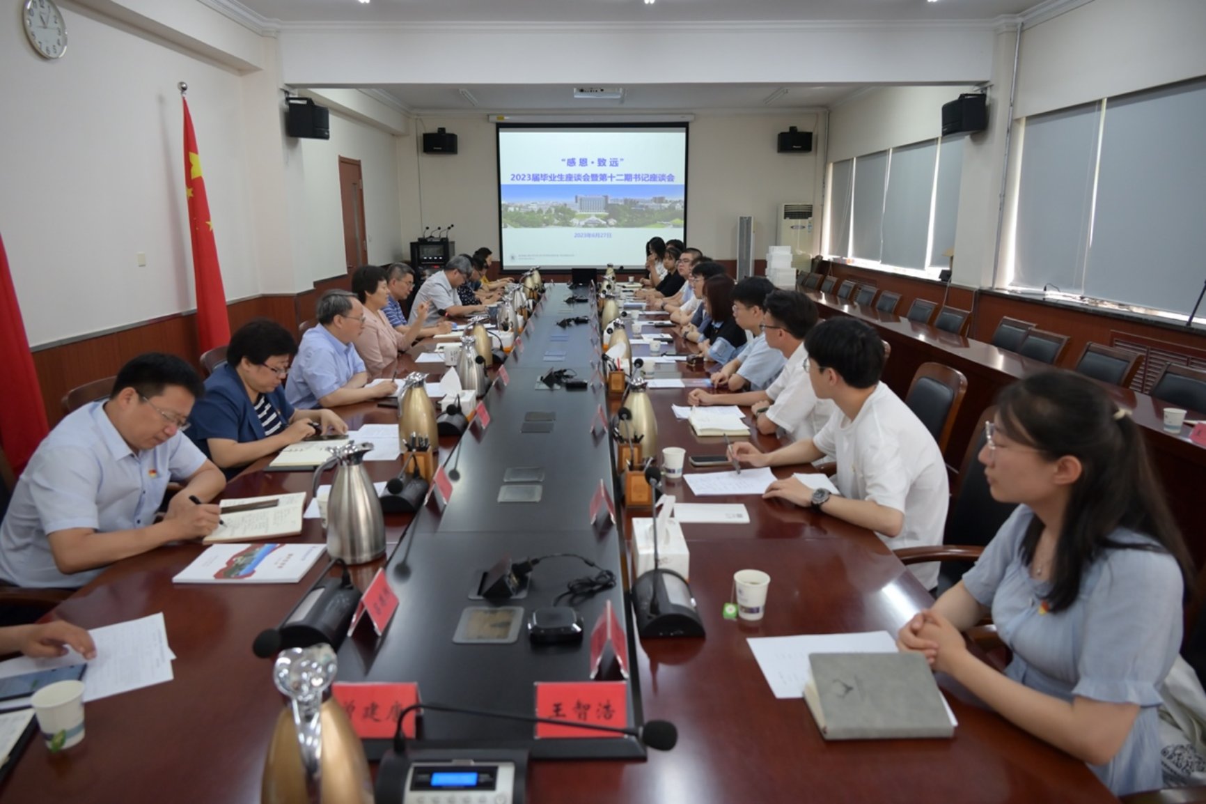 6月27日下午,学校召开以“感恩·致远”为主题的2023届毕业生座谈会暨第十二期书记座谈会。学校党委书记刘颖,副书记冯学会,党委常委、副院长陈家庆、王伟、退休教师代表曾建唐教授及相关职能部门负责人出席会议。