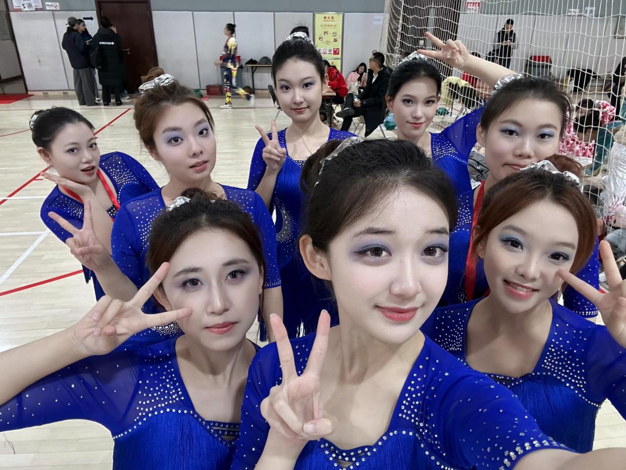 这份荣光来自师生同心的并肩作战,这份佳绩来自青春无畏的热血绽放。备战阶段,邓彦青老师连续多个周六日系统化地开展训练:编排队型、纠正动作、提高体能、甚至姿态和表情都逐个统一,队员们从心理素质到表现能力全方位得到了提升。比赛中老队员全程带头示范、稳定军心,用丰富的赛场经验为团队筑牢根基;首次登场的大一新队员们,更是诠释了新生力量的锐气。那些膝盖的青紫、手掌的伤痕都是她们赛场下的见证。那些脚踝受伤贴着膏药的日子,那些一遍遍练习成套统一节奏的日子,这些,都成了她们来时路上的勋章。