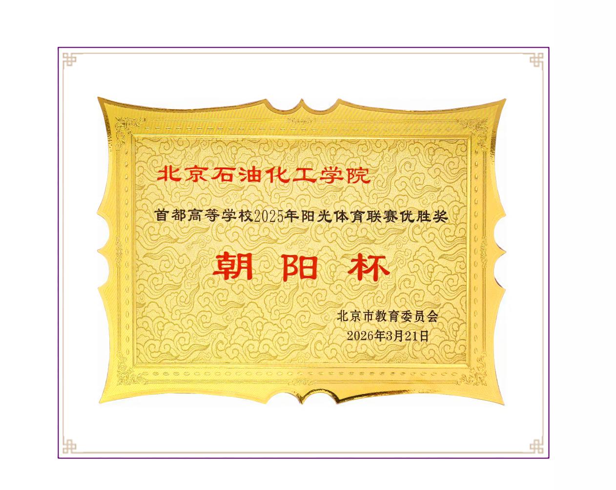 首都高等学校阳光体育联赛“朝阳杯”作为首都高校体育竞赛最高奖项,由北京市教育委员会评选,表彰年度内在推动校园群众性体育活动取得优异成绩的学校,是为彰显体育育人成效而设立的奖项。群众性体育项目包括跳绳、龙舟、体育舞蹈、拓展、体育教师教学基本功比赛、体育科学论文报告会、体育教师思政演讲比赛等近30多个项目,80余所高校参与并通过积分评选出甲乙组高校前8所获得“朝阳杯”优胜奖。我校在首都高校2025年阳光体育联赛“朝阳杯”评选中获得乙组第二名,我校已连续十四年获得“朝阳杯”殊荣。