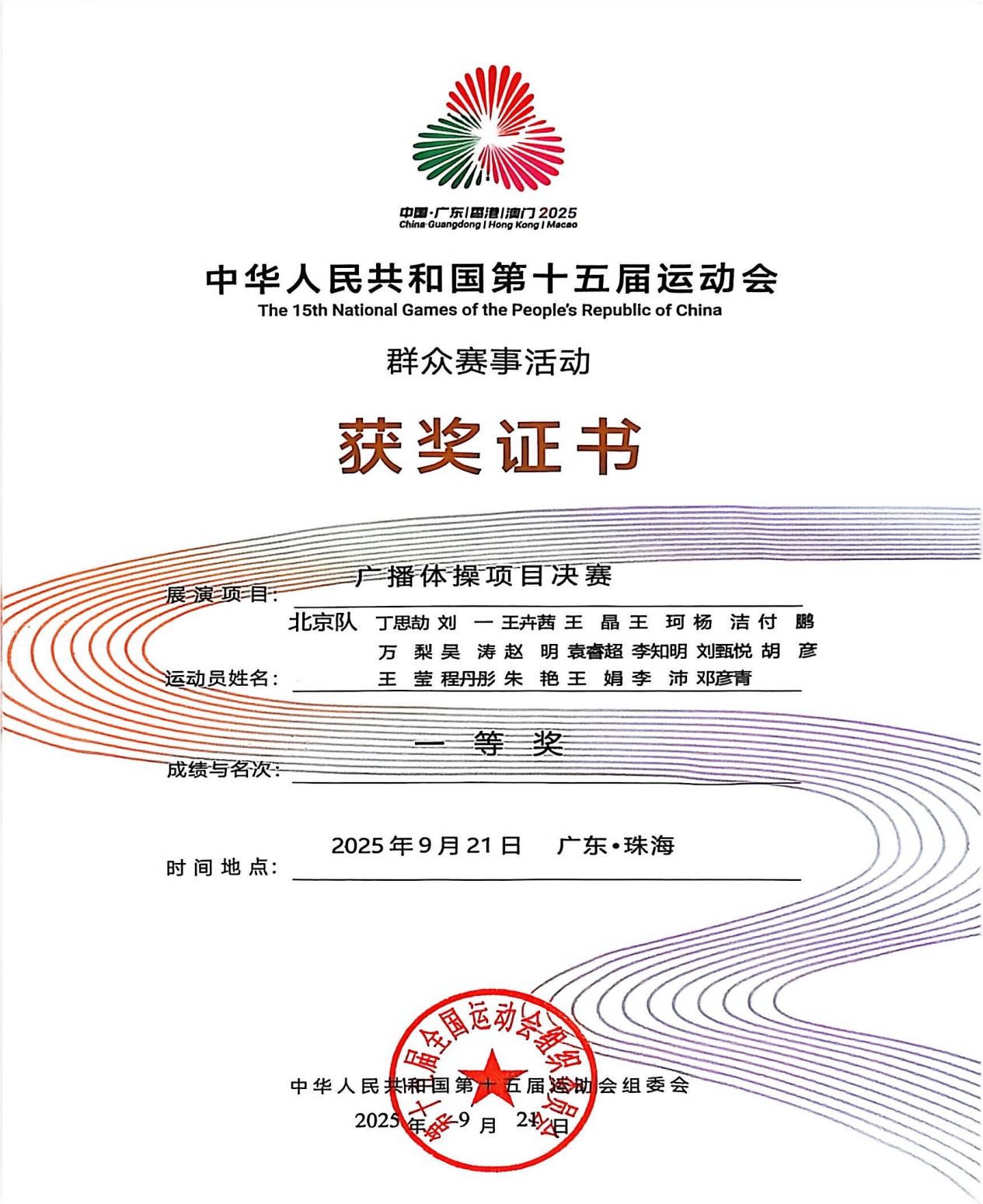 2025年9月21日,第十五届全国运动会群众展演广播体操项目决赛在中山大学珠海校区体育馆圆满落幕。我校体育部教师邓彦青代表北京队参加第十五届全国运动会群众组广播操项目决赛,随北京代表队在激烈角逐中脱颖而出,夺得第九套广播体操团体赛冠军,为北京群众体育事业再添殊荣。