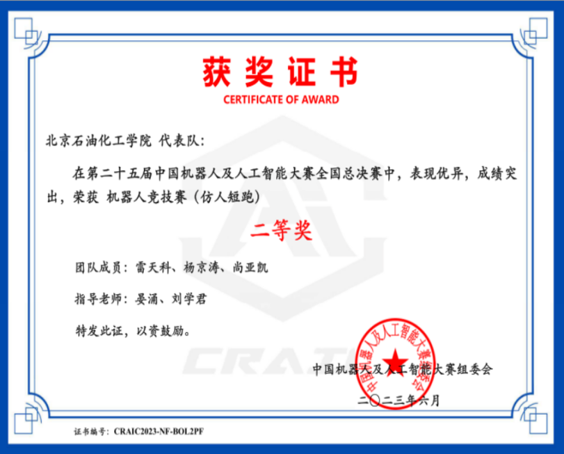 第26届中国机器人及人工智能大赛国家二等奖、国家三等奖
