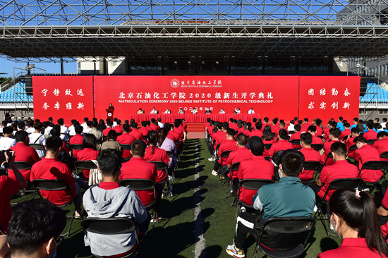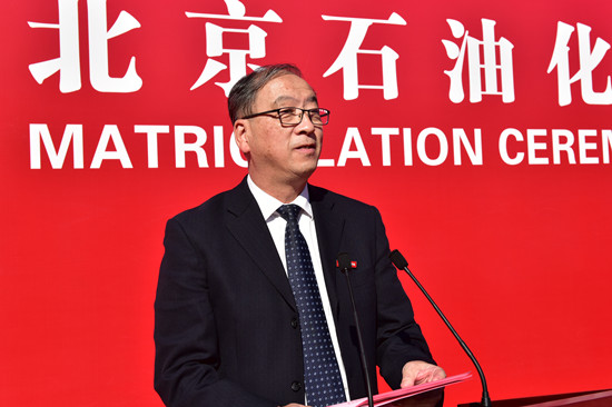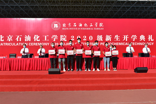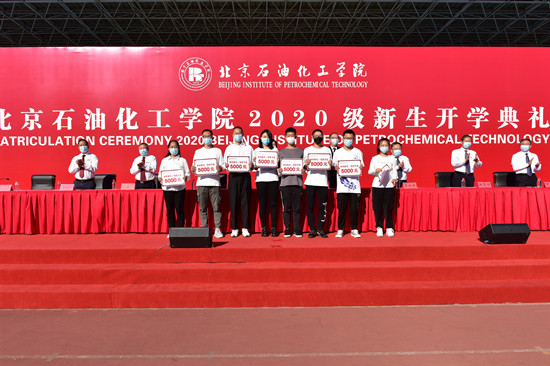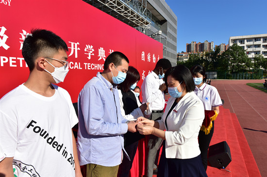 党委书记刘颖为2020级新生代表颁发北京石油化工学院校徽。