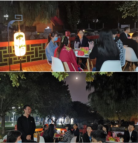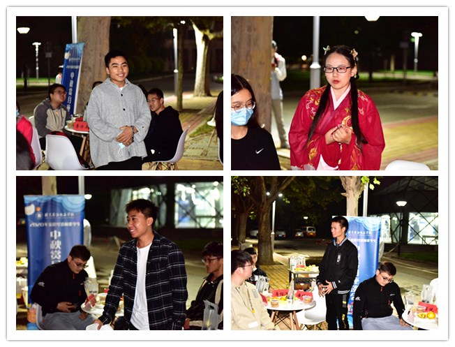 明月映溪塘,荷香溢四方。人文社科学院的同学们送上了一杯杯精心制作的咖啡。大家伴着皎洁的圆月,听着潺潺流水声,品着咖啡,尝着月饼,师生相伴,温暖心间。“微风月明撩树影,流水昏灯扶绿荫。佳人才子会亭台,共赏天际园月明。”信息工程学院的李绍汪同学随兴作诗一首,引得大家争相吟诵诗句,表达美好的思念和浓浓的家国情怀。