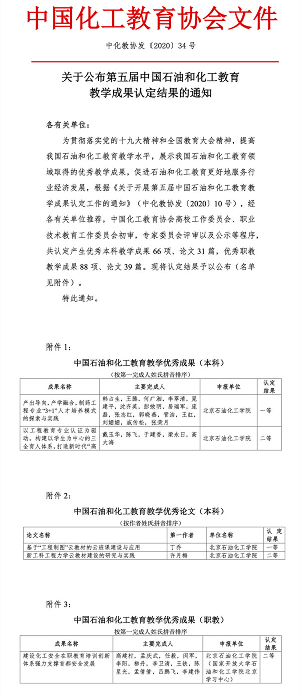 近日,中国化工教育协会公布了第五届中国石油和化工教育教学成果奖评选结果,我校共有2项教学成果获优秀成果奖,2篇论文获优秀论文奖,1项教学成果获优秀成果奖(职教)。