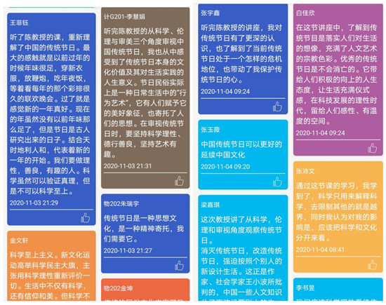 参加讲座的同学还通过云班课APP进行了热烈的课堂讨论,同学们高度认同传统节日延续中国传统文化的观点。有同学发表感言说:“听完陈教授的讲座,我对传统节日有了更深的认识,意识到传统节日所处的危机,也带动了我保护传统节日的心。”