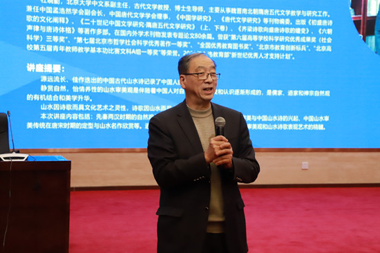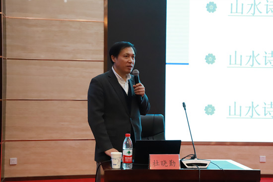 杜教授在讲座中将中国古代的山水诗划分为朦胧时期、兴起时期、繁盛时期和变异时期四个发展阶段。中国古代,上古时期就有“敬畏山水”的神话传说,先秦两汉以诗歌描写景物“山水比德”“道法自然”,魏晋南北朝以谢灵运、谢脁为代表,中国山水审美和山水诗兴起,并于唐宋定型。静赏自然、怡情养性的山水审美观是伴随着中国人对自然山川的开发和认识逐渐形成的,是儒家、道家和禅宗自然观的有机结合和美学升华。佳作迭出的中国古代山水诗记录了中国人的心路历程,也成为中华民族传统文化精神最集中的体现。杜教授通过大量中国古代山水诗名篇佳作的赏析,勾连历史时代背景和诗人个体成长历程,细致描绘了中国古代文人的文化审美和情感世界,帮助学生理解山水、欣赏清音。