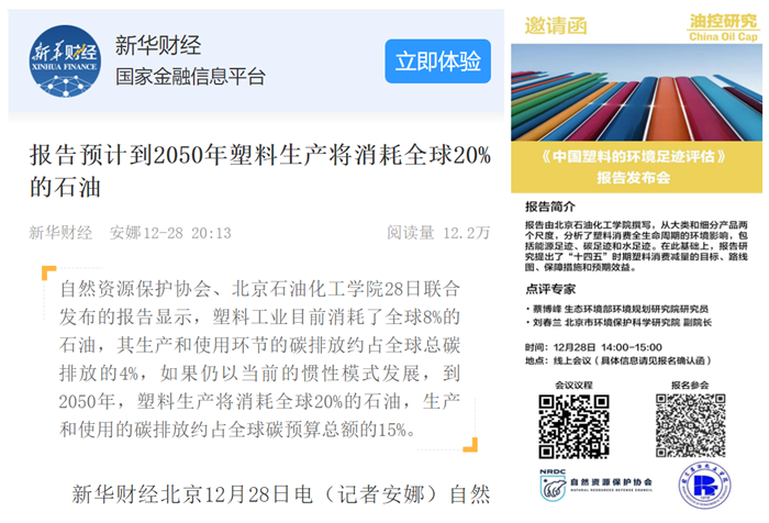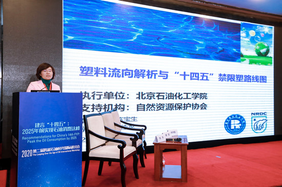 12月21日,由中国电动汽车百人会(China EV100)和自然资源保护协会(NRDC)共同主办的“第二届跨越石油时代国际研讨会”在京召开。会议主题为建言“十四五”:2025年前实现石油消费达峰。我校人文社科学院曹淑艳博士应邀参会,并向大会做“塑料流向解析与十四五禁限塑路线图”专题报告。根据大会安排,于28日举行《中国塑料的环境足迹评估》研究报告专题发布会,该研究报告由曹淑艳、陈宝生、郭红、孙佳龙研究团队撰写,由自然资源保护协会与我校联合发布。