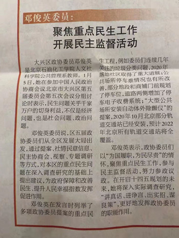 中国人民政治协商会议北京市大兴区第五届委员会成立于2016年,每年召开一次全会,本次会议是本届政协的第五次全会。我校地处大兴区,3名政协委员通过大兴区政协这一平台,承担起加强学校和大兴区联系的桥梁作用,围绕大兴区经济、社会、文化、科技等领域建言献策,发挥了积极作用。