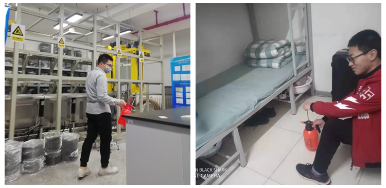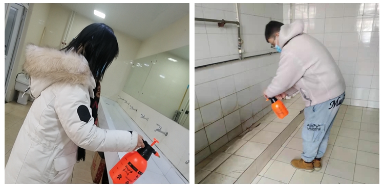 留校学生也积极行动起来,对实验室、宿舍、卫生间进行消毒。
