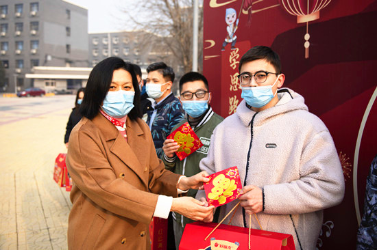 过年了,校领导们更是挂念着寒假留校的同学。刘颖看望了春节留校学生,详细询问了他们寒假在校期间的学习与生活情况,并为他们发放了过年大礼包。“我了解到很多同学是因为疫情原因没有回家,有遗憾,但也是一个难忘的经历。今天除夕,大家都要给父母打个电话、视个频,给他们拜个年,让他们放心。”刘颖书记仔细叮嘱着,“你们都是风华正茂正青春,我相信2021年会在同学们的努力下更加精彩!”