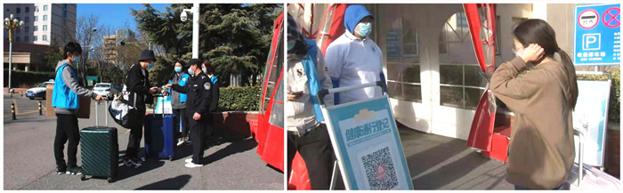 (志愿者们帮助同学们搬运行李,耐心引导大家出入)