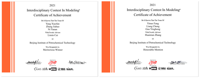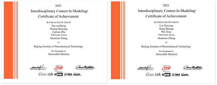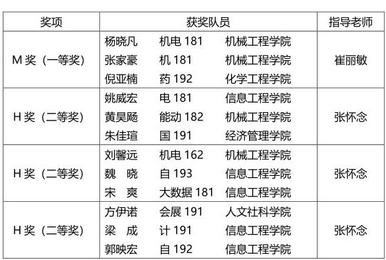 4月24日,2021年美国大学生数学建模竞赛获奖名单公布,我校组织参加该项国际竞赛的9支队伍中,由崔丽敏老师指导的1支参赛队(机电181杨晓凡、机181张家豪、药192倪亚楠组成)获得M奖(一等奖),由张怀念老师指导的3支参赛队(电181姚威宏为代表的参赛队、机电162刘馨远为代表的参赛队、会展191方伊诺为代表的参赛队)获得H奖(二等奖),我校在此项国际性赛事的参赛队伍数量和获奖数量均取得历史性突破。