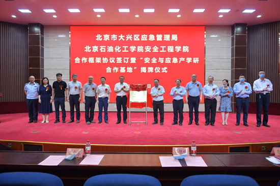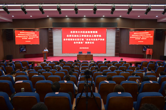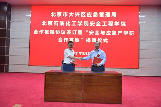5月23日上午,北京石油化工学院安全工程学院和大兴区应急管理局在北京石油化工学院致远讲堂隆重举行合作框架协议签约仪式暨共建“安全与应急产学研合作基地”揭牌仪式。大兴区委常委、副区长石银峰、大兴区应急管理局党委书记、局长李刚、大兴区应急管理局其他班子成员,学校党委常委、副校长焦向东、陈家庆和安全工程学院领导班子、全体师生参加签约仪式,陈家庆副校长主持签约仪式。