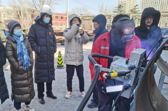 校企双方领导对市政管道焊接机器人正式应用到石景山区供水管网一期工程建设非常重视,北京市自来水集团禹通市政工程有限公司党委书记兼董事长郑少博与我校陈家庆副校长牵头,提前组织双方人员就施工方案制定、施工技术指导、企业焊工培训、后续深化合作等事宜当面进行沟通交流。