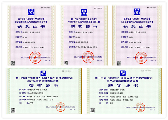 本次大赛集中了全国551所高等院校,1045支代表队,6743名同学参赛,涵盖机械、建筑、道桥和水利四个类别。我校机械学院共选拔出13名同学参赛,参加了机械类别的制图基础知识、尺规绘图、产品信息建模、轻量化设计与3D打印等竞赛项目。参赛同学在工程图学教研室丁乔、仵亚红、孙轶红、李茂盛等老师们的精心指导下,经过紧张的强化训练,取得了可喜的成绩:共获得团体一等奖1项、团体二等奖1项、团体三等奖3项以及个人二等奖3项和个人三等奖6项。