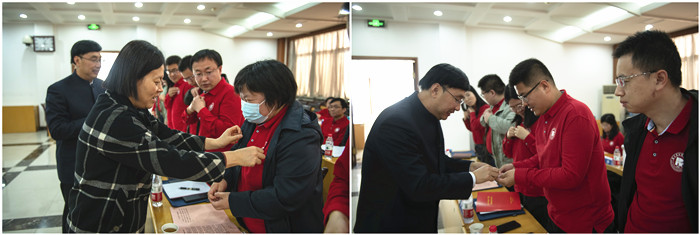 (党委书记刘颖,党委副书记、校长罗学科为新入职教师授校徽)