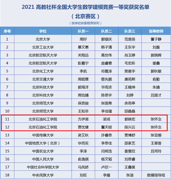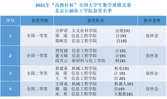 11月15日,2021年“高教社杯全国大学生数学建模竞赛”获奖名单揭晓,我校参赛队伍斩获2个全国一等奖(全国共292个、北京赛区18个)、2个全国二等奖(北京赛区共69个),创造了学校在“全国大学生数学建模竞赛”历史最好成绩,实现了国家级获奖数量的突破,在北京市属高校中名列前茅。