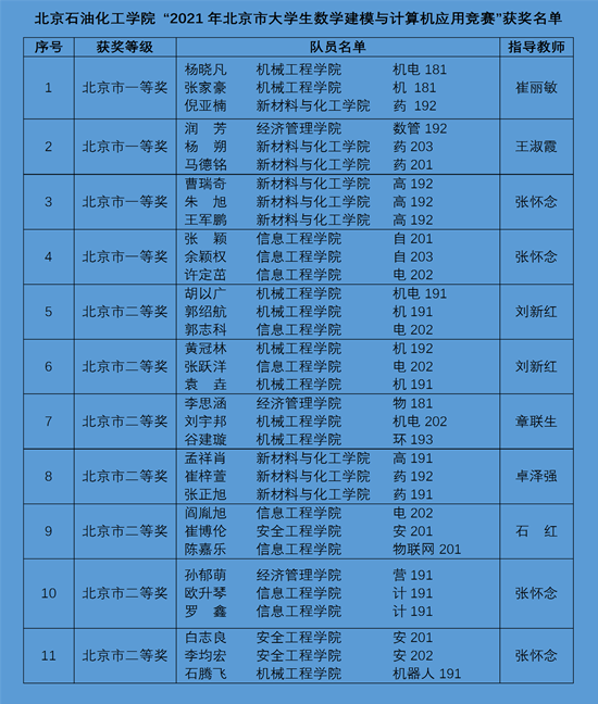 2021年“北京市大学生数学建模与计算机应用竞赛”共有56所高校的2800多支队伍、8000余人参赛,竞争异常激烈。学校组建的40支队伍在致远学院教师团队的精心指导下,取得11项北京市奖项。参赛队伍比2020年增加一倍,奖项增加了7项。