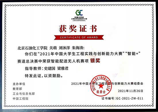 为强化工程伦理意识,提升适应全球可持续发展的工程师培养质量,更好服务于国家创新驱动与制造强国战略, 近日,2021年中国大学生工程实践与创新能力大赛全国总决赛在清华大学举办。由我校工程师学院梁雅君老师、史建国老师带队,机械工程学院郑鑫、关萌、朱海涛和经济管理学院刘沐洋四位同学组成的参赛队伍,在决赛中获得“智能+”赛道总决赛银奖。