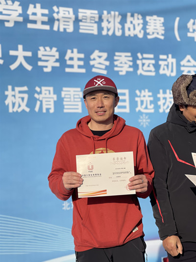 此前的1月11日至14日举办的第八届“万科杯”全国大学生滑雪挑战赛(华北赛区)暨第31届世界大学生冬季运动会选拔赛上,我校滑雪队由曾旗、赵臻两位老师带队,八位同学组队参赛。最终,获得单板团体亚军,男子单板第二、第八名,女子单板第二名,赵甄老师获得“优秀教练员”称号。滑雪队成功拿到了全国大学生滑雪赛的入场券。