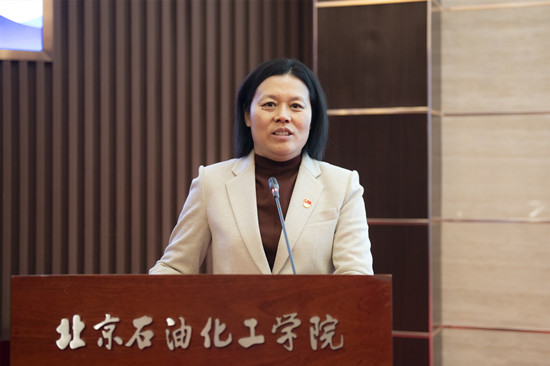 学校党委书记刘颖为北京石油化工学院冬奥志愿者服务队授旗,为全体志愿者讲授生动的冬奥赛前“第一课”。