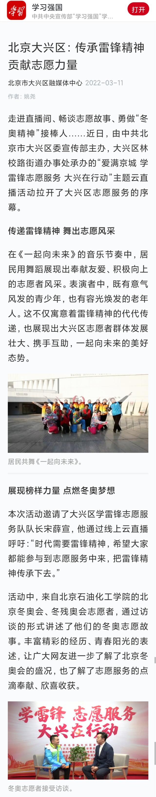 近日,学习强国总平台报道了大兴区“传承雷锋精神 贡献志愿力量”主题活动,我校服务冬奥会、冬残奥会志愿者教师代表崔洋、学生代表蒋林轩、杨捷、戴铁诚参加此次活动。该活动由中共北京市大兴区委宣传部主办,大兴区林校路街道办事处承办。活动中,我校服务北京冬奥会、冬残奥会志愿者教师代表崔洋、学生代表蒋林轩、杨捷、戴铁诚通过访谈的形式讲述了他们的冬奥志愿故事,传播志愿者精神,向广大网友展示了北石化志愿者的良好精神风貌。