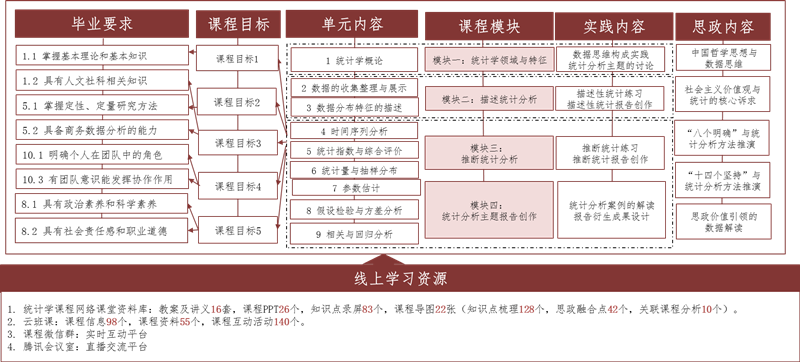 《统计学》是为经济管理类各专业本科生开设的一门专业基础必修课。依据学校发展定位和经济管理学院学生特点,本课程在多轮授课经验总结、多次问题剖析、密切关联时政问题的基础上,基于OBE教学理念、围绕“以学生为中心”、聚焦教学实践的真实问题,开展“互联网+”线上教学建设。