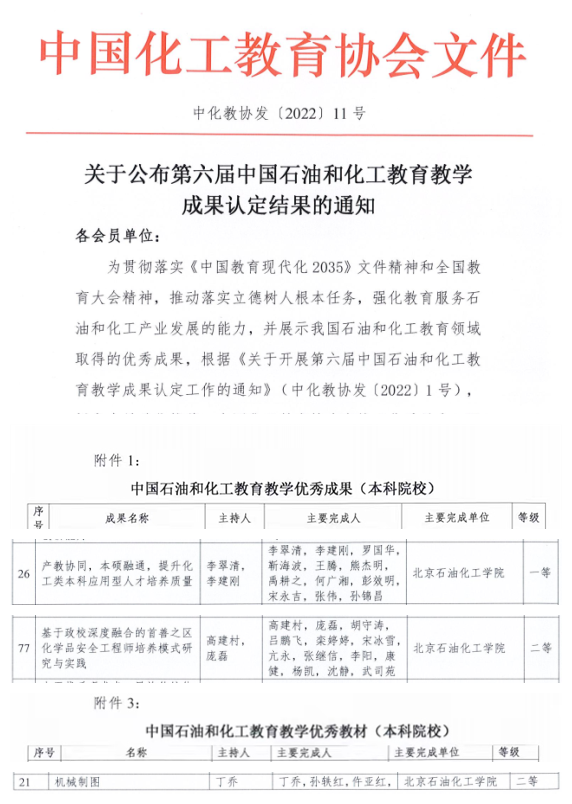 近日,中国化工教育协会公布了第六届中国石油和化工教育教学成果认定结果,由我校新材料与化工学院李翠清教授团队主持的“产教协同,本硕融通,提升化工类本科应用型人才培养质量”教学成果荣获2022年中国石油和化工教育教学优秀成果一等奖;安全工程学院高建村教授团队主持的“基于政校深度融合的首善之区化学品安全工程师培养模式研究与实践” 荣获2022年中国石油和化工教育教学优秀成果二等奖,机械工程学院丁乔教授团队主编的《机械制图》荣获2022年中国石油和化工教育教学优秀教材二等奖。