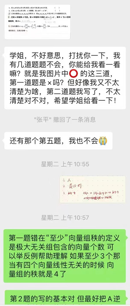 授课结束后,讲师团成员通过微信群积极帮助同学解决疑难问题。本学期“线性代数”期末辅导虽然已经结束,但是讲师团后期还会时行高等数学、概率统计、大学物理等课程的学业辅导授课活动,为更多的同学答疑解惑,帮助大家克服学业上的困难。