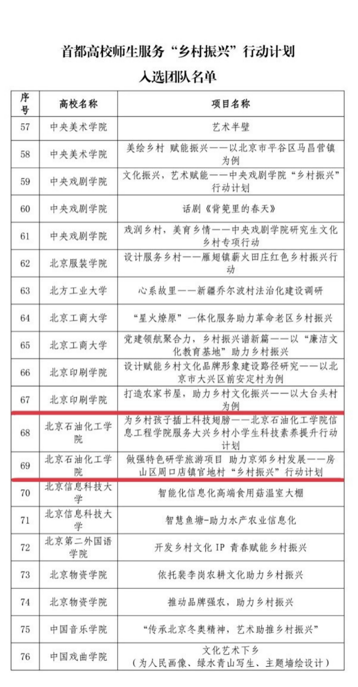 近日,北京市学校思想政治工作中心公布了入选首都高校师生服务“乡村振兴”行动计划的100支团队名单。其中,我校信息工程学院和经济管理学院的两支实践队伍成功入选。