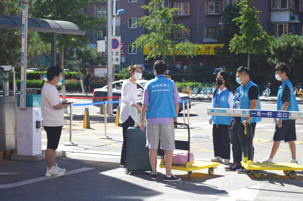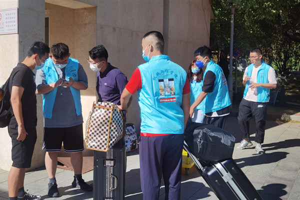 老师和志愿者早早来到在学校门口等待学生的到来,帮助学生运送行李到宿舍……